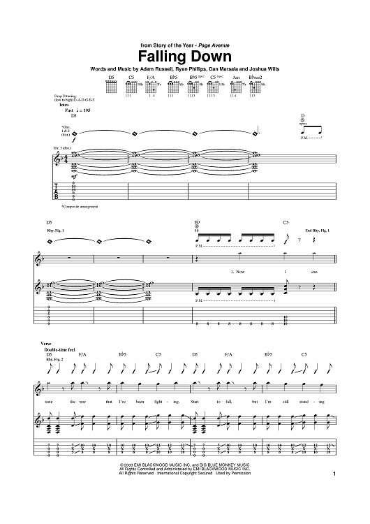 Digital Sheet Music for Falling Down by Dan Marsala, Ryan Phillips, Adam Russell, Story Of The Year scored for Guitar Tab; id:374623
