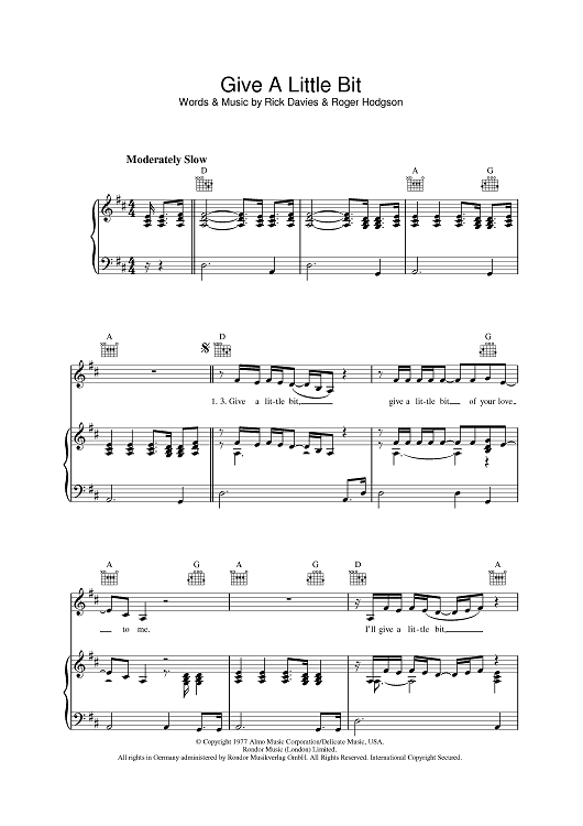 Digital Sheet Music for Give A Little Bit by Rick Davies, Roger Hodgson, Supertramp scored for Piano/Vocal/Chords; id:394698