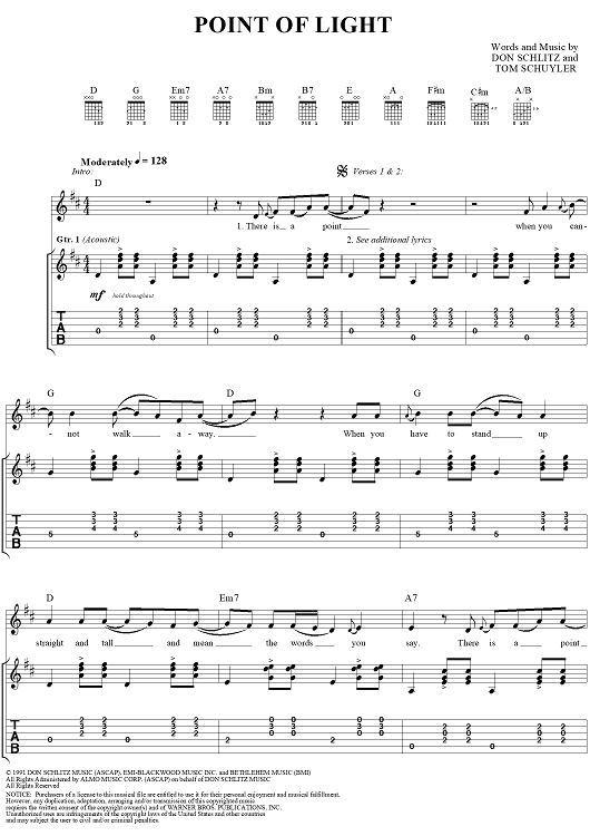 Digital Sheet Music for Point of Light by Randy Travis, Don Schlitz, Tom Schuyler scored for Guitar Tab/Vocal; id:113623