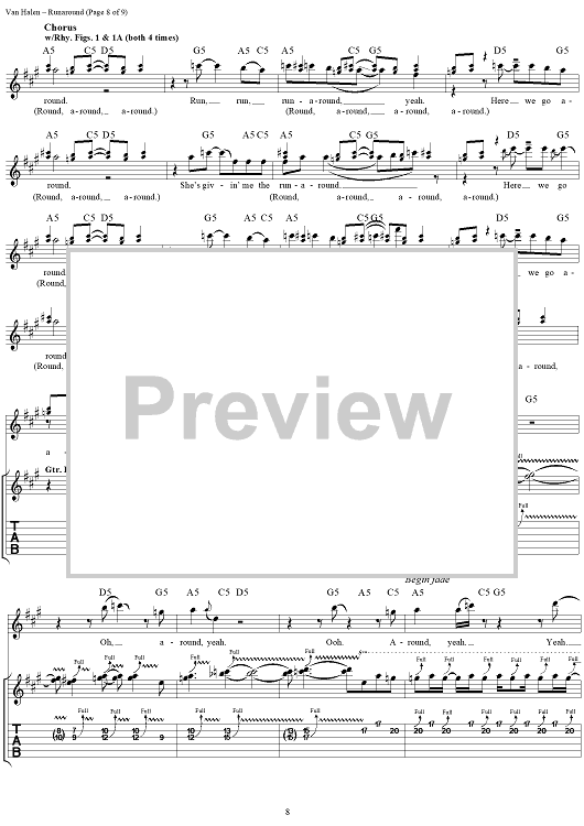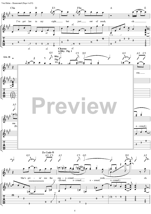 Digital Sheet Music for Runaround by Eddie Van Halen, Sammy Hagar, Michael Anthony, Alex Van Halen, Van Halen scored for Guitar Tab/Vocal; id:110003