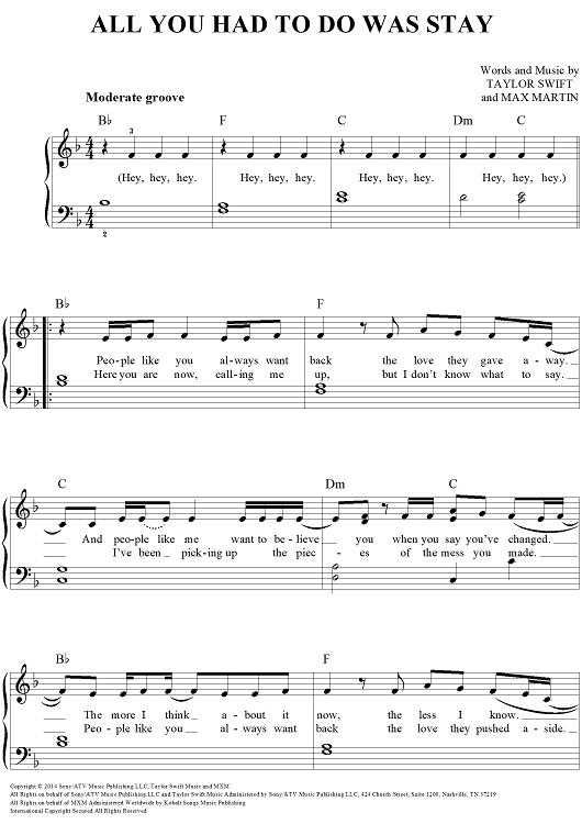 Digital Sheet Music for All You Had To Do Was Stay by Max Martin, Taylor Swift scored for Easy Piano/Vocal/Chords; id:460078