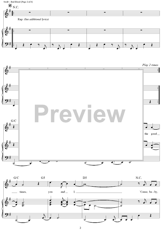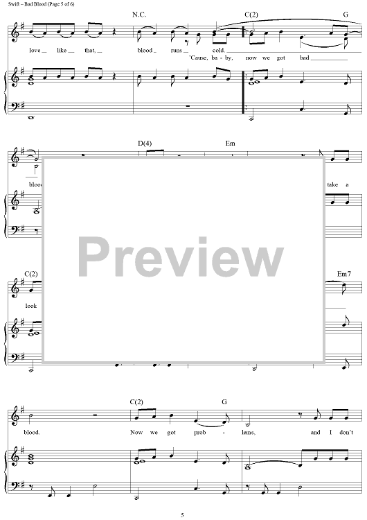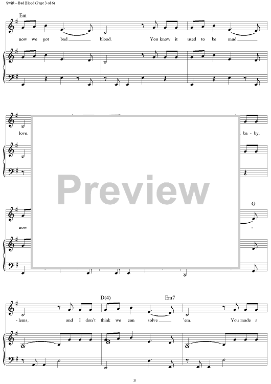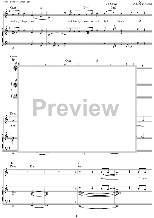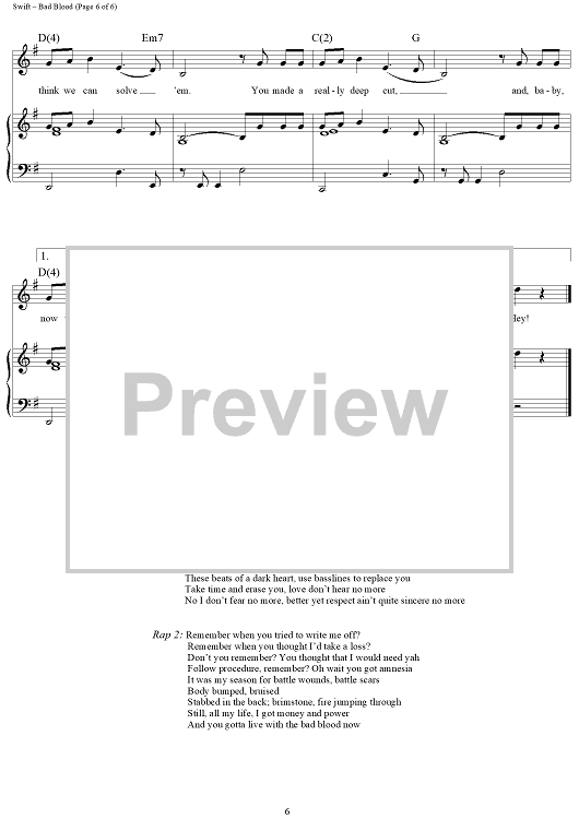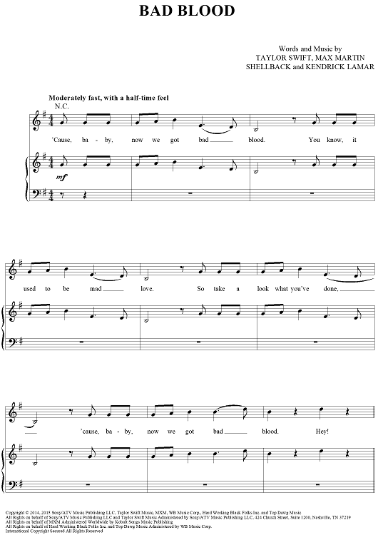 Digital Sheet Music for Bad Blood by Max Martin, Taylor Swift, Shellback, Kendrick Lamar scored for Piano/Vocal/Chords; id:453259