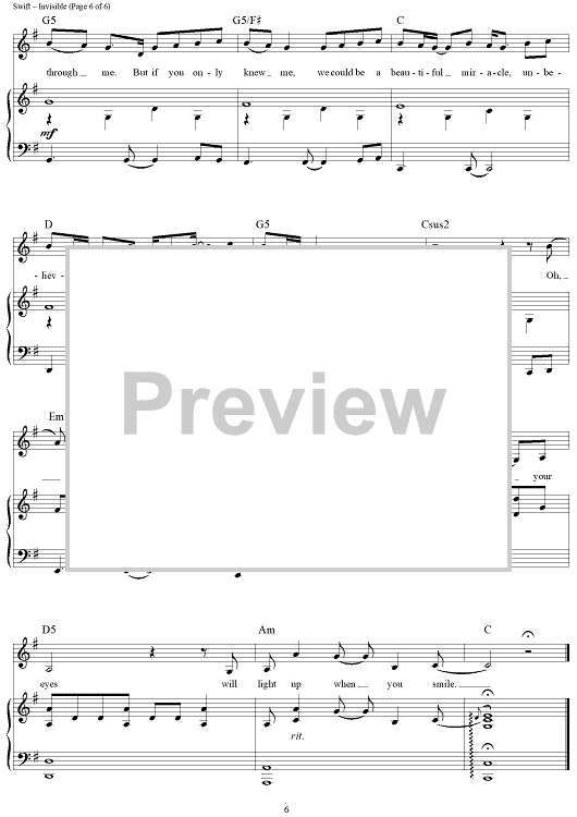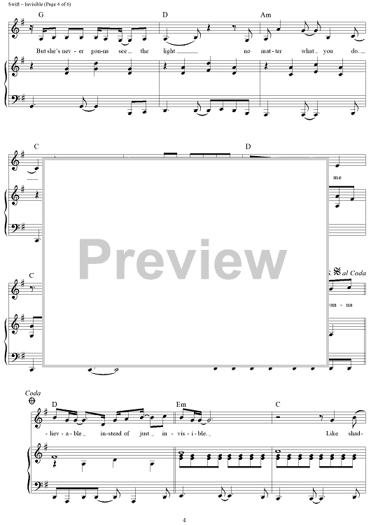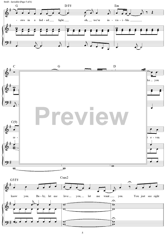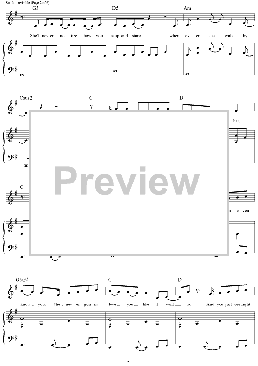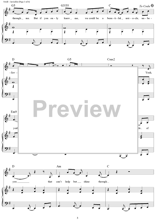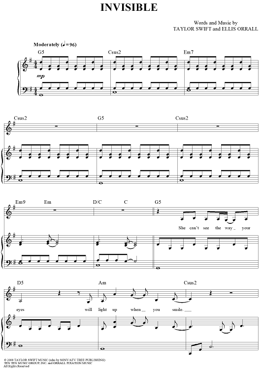 Digital Sheet Music for Invisible by Robert Ellis Orrall, Taylor Swift scored for Piano/Vocal/Chords; id:438031