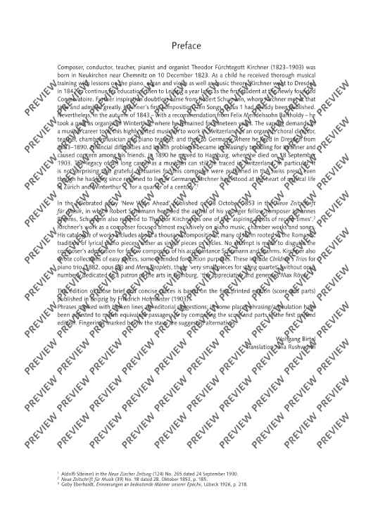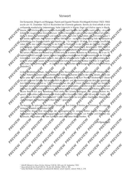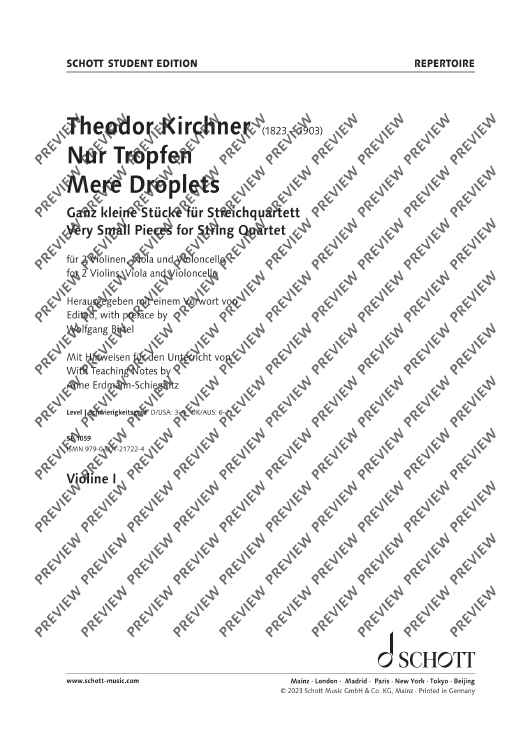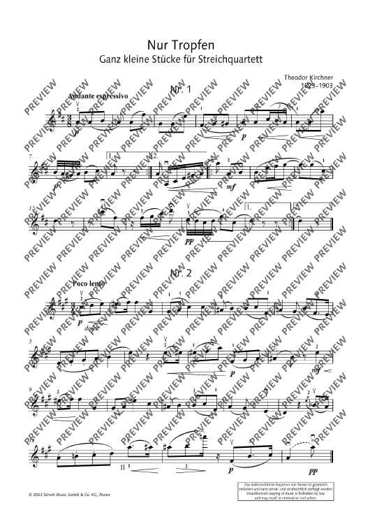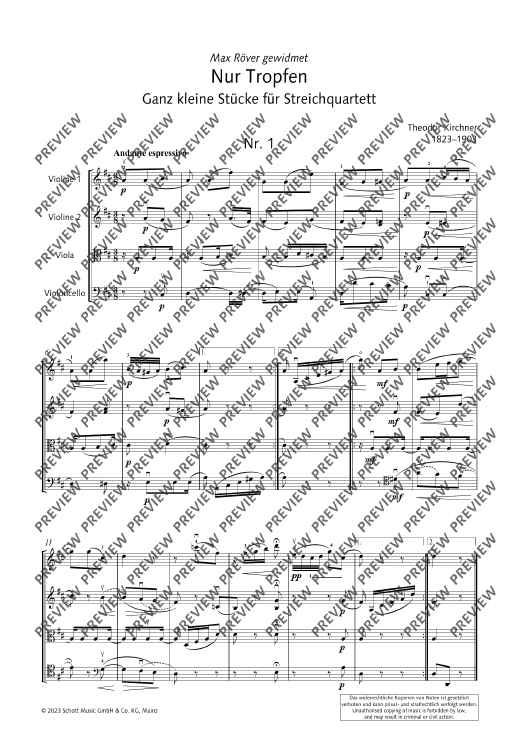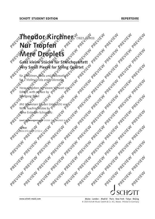 The composer Theodor Kirchner (1823-1903), a friend of Johannes Brahms, devoted his work almost exclusively to piano and chamber music as well as lieder. Among his numerous works are also collections pieces of easy difficulty or with easy educational demands. They include the "very small pieces for string quartet" (without opus number). These pieces are seven miniatures of varying character, from cantabile to lively. Since they are, for the most part, technically easy to master, they offer the opportunity to practise chamber music ensemble playing: listening to each other, responding, coming in together, taking over and other challenges of the string quartet. Quartet sound itself can also be trained with the pieces - the ideal preparation for auditions and competitions.
