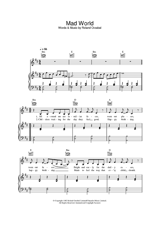 Digital Sheet Music for Mad World by Roland Orzabal, Alex Parks, Gary Jules, Michael Andrews, Tears For Fears scored for Piano/Vocal/Chords; id:378755