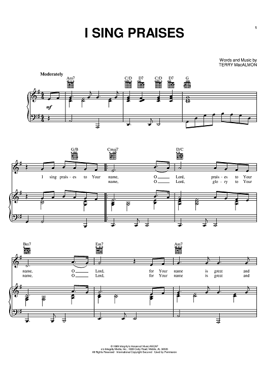 Digital Sheet Music for I Sing Praises by Terry MacAlmon scored for Piano/Vocal/Chords; id:371683