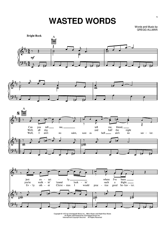 Digital Sheet Music for Wasted Words by Gregg Allman, The Allman Brothers Band scored for Piano/Vocal/Chords; id:368505