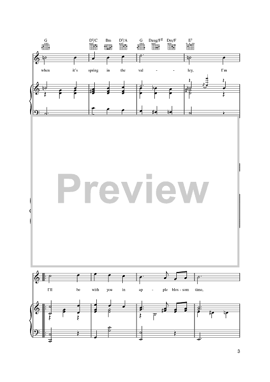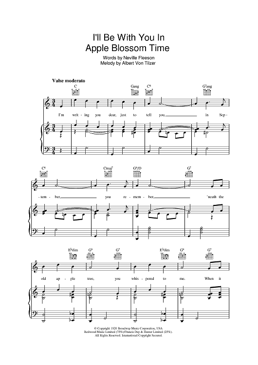 Digital Sheet Music for I'll Be With You In Apple Blossom Time by The Andrews Sisters, Albert von Tilzer, Neville Fleeson scored for Piano/Vocal/Chords; id:392889