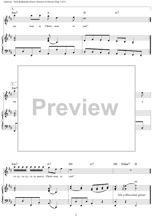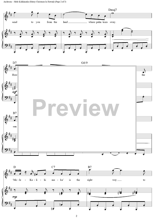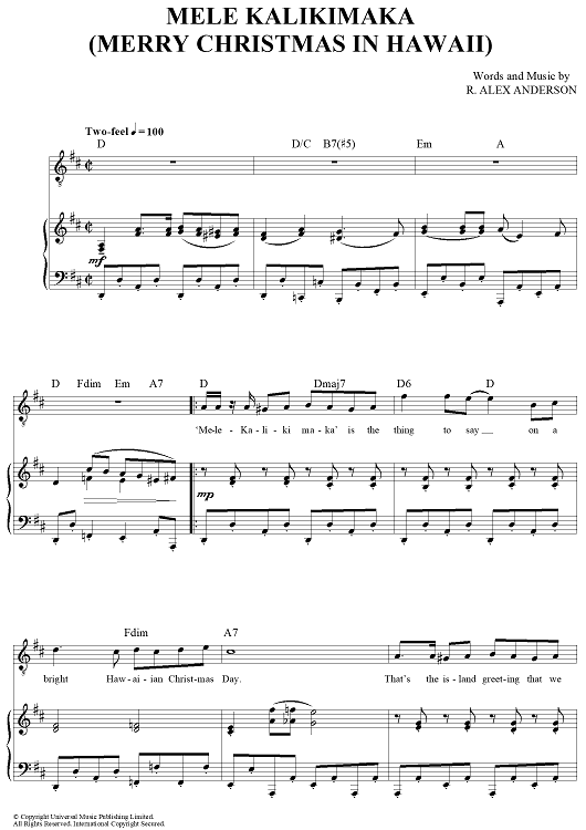 Digital Sheet Music for Mele Kalikimaka (Merry Christmas In Hawaii) by Bing Crosby, The Andrews Sisters, R. Alex Anderson scored for Piano/Vocal/Chords; id:392777