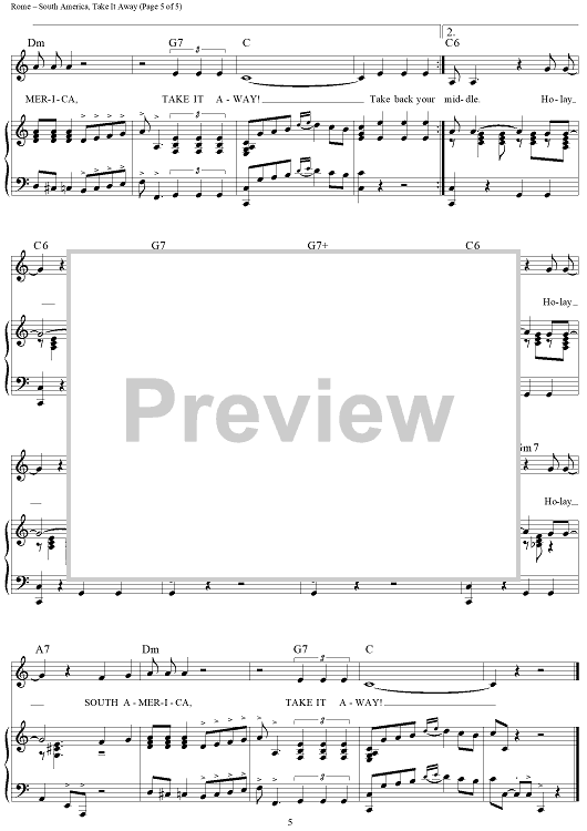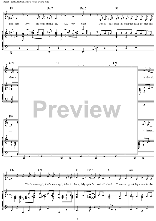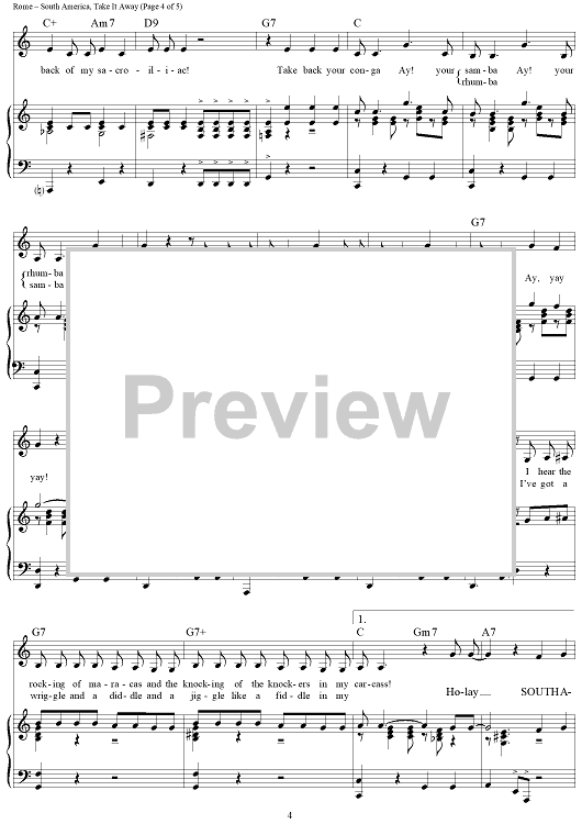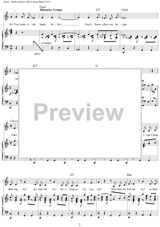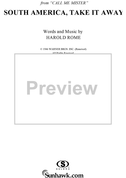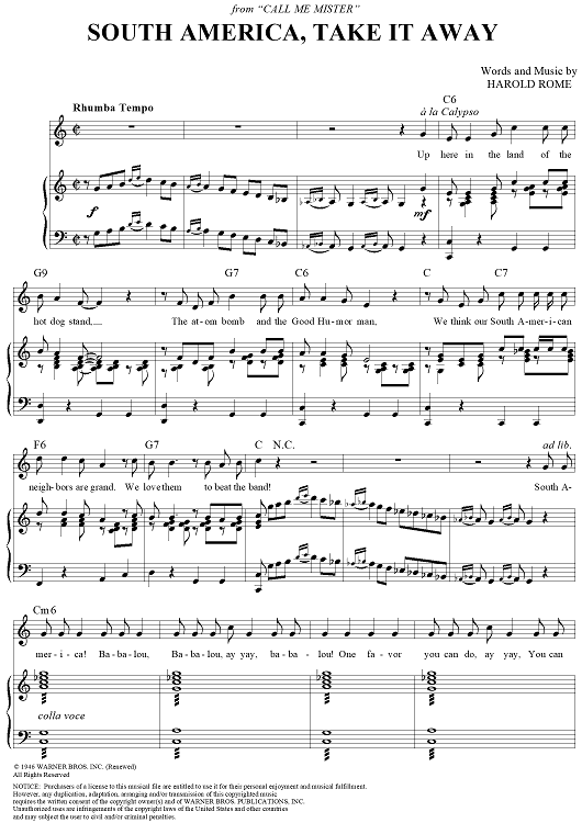 Digital Sheet Music for South America, Take It Away by Bing Crosby, The Andrews Sisters, Harold Rome scored for Piano/Vocal/Chords; id:112476