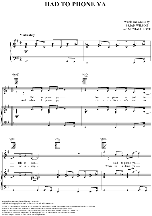 Digital Sheet Music for Had to Phone Ya by Brian Wilson, The Beach Boys, Mike Love scored for Piano/Vocal/Chords; id:264126