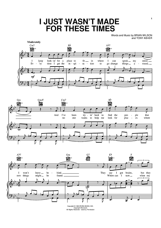 Digital Sheet Music for I Just Wasn't Made For These Times by Brian Wilson, The Beach Boys, Tony Asher scored for Piano/Vocal/Chords; id:370769