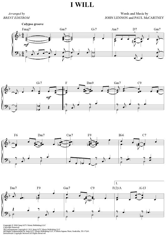 Digital Sheet Music for I Will by Paul McCartney, The Beatles, John Lennon, Brent Edstrom scored for Piano Solo; id:460213