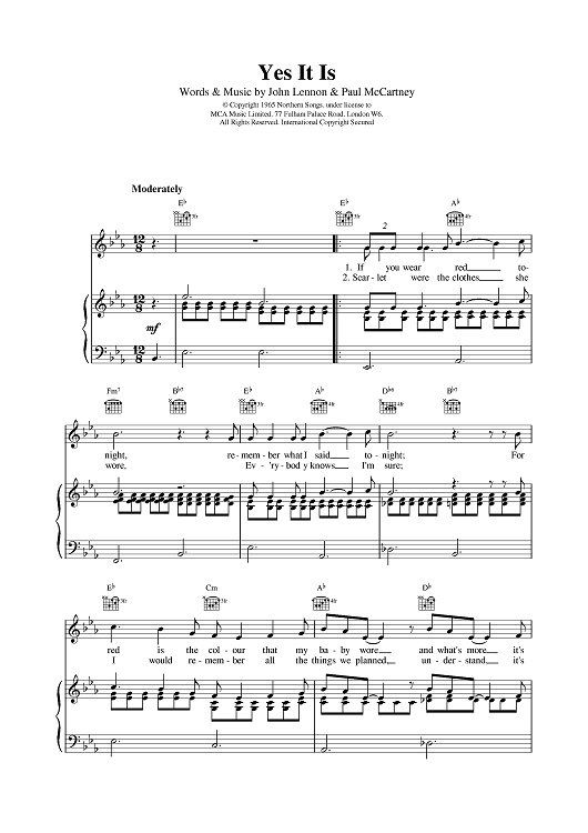 Digital Sheet Music for Yes It Is by Paul McCartney, The Beatles, John Lennon scored for Piano/Vocal/Chords; id:377490