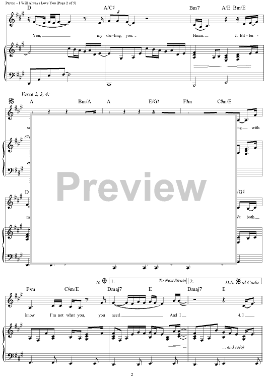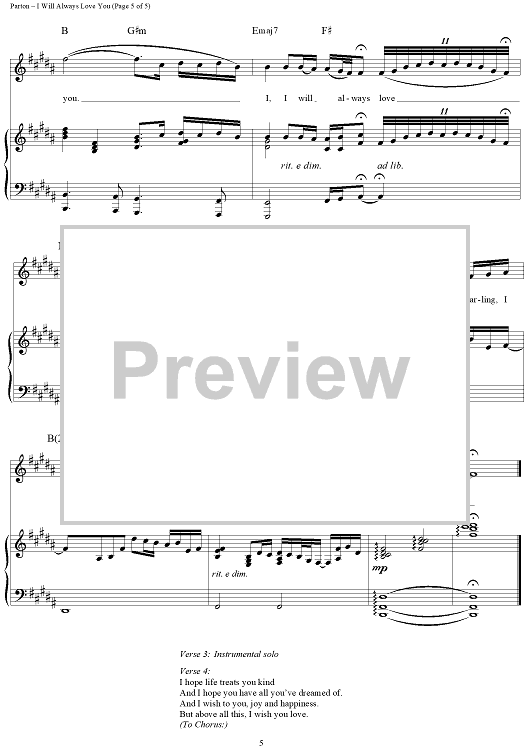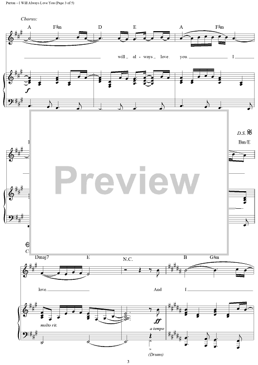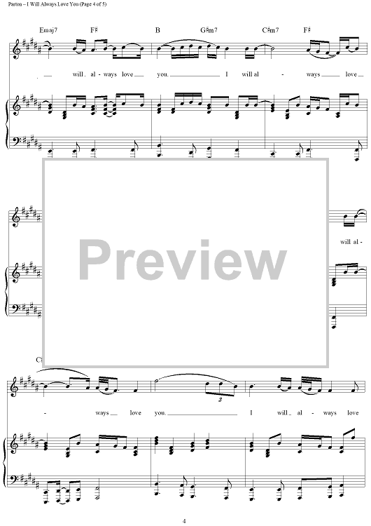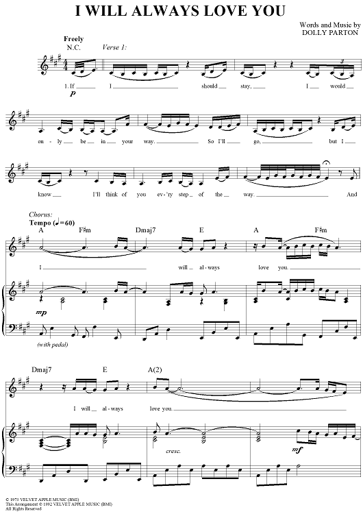 Digital Sheet Music for I Will Always Love You by Whitney Houston, Dolly Parton scored for Piano/Vocal/Chords; id:111500