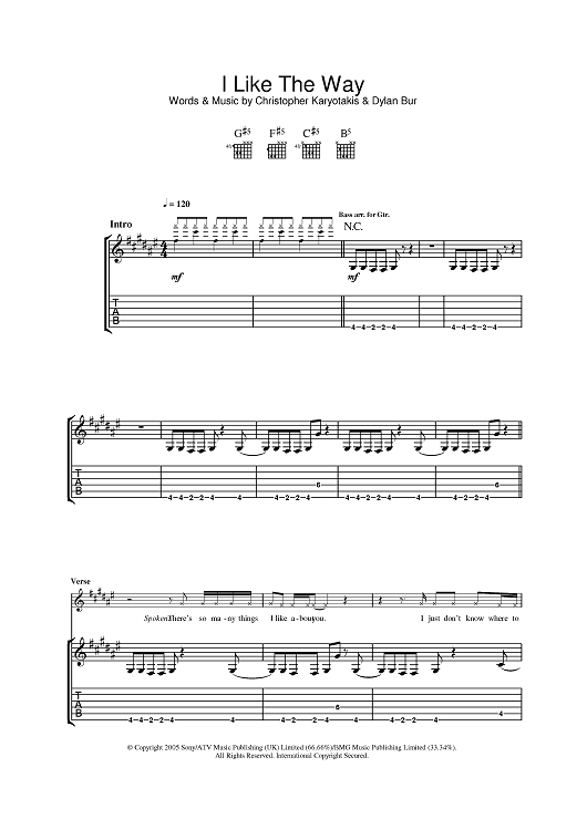 Digital Sheet Music for I Like The Way by The Bodyrockers, Dylan Burns, Christopher Karyotakis scored for Guitar Tab; id:387168