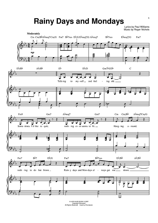 Digital Sheet Music for Rainy Days And Mondays by The Carpenters, Roger Nichols, Paul Williams scored for Piano/Vocal/Chords; id:371113