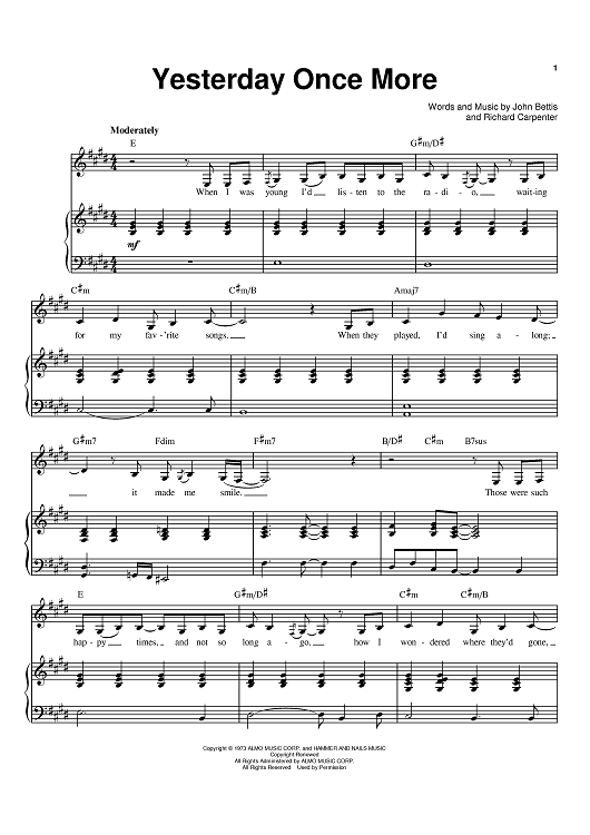 Digital Sheet Music for Yesterday Once More by The Carpenters, Richard Carpenter, John Bettis scored for Piano/Vocal/Chords; id:371116