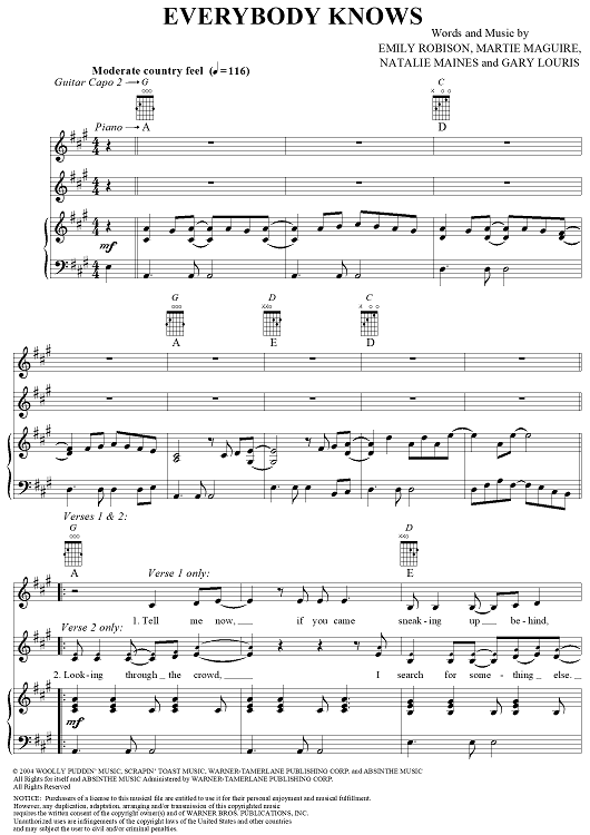 Digital Sheet Music for Everybody Knows by The Chicks, Emily Robison, Martie Maguire, Natalie Maines, Gary Louris scored for Piano/Vocal/Chords; id:355016