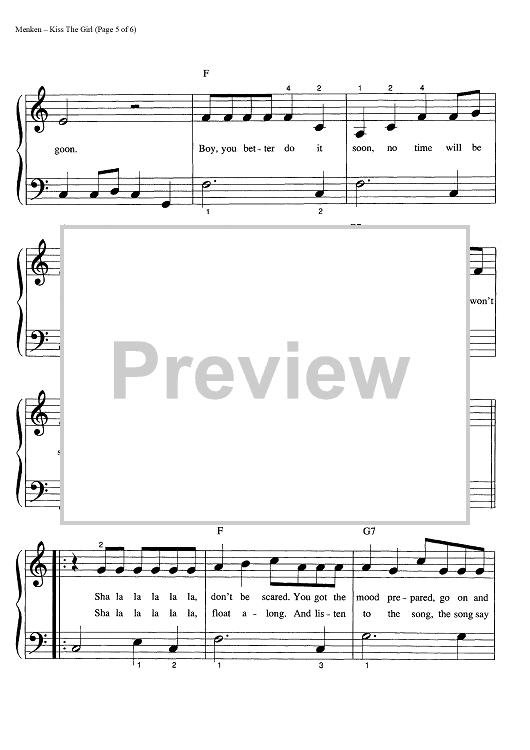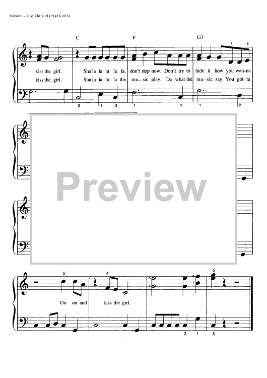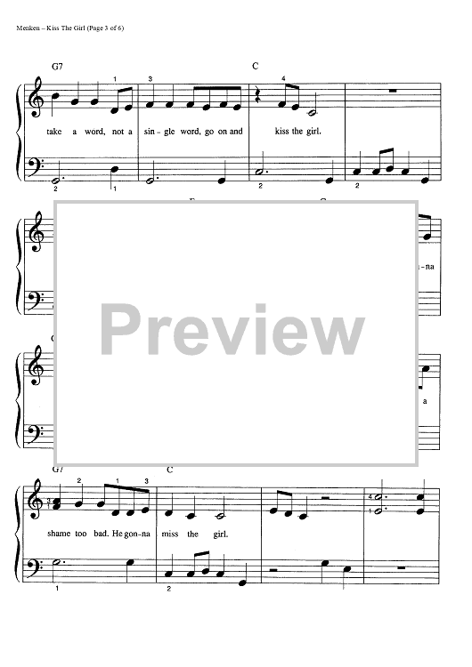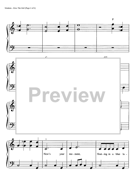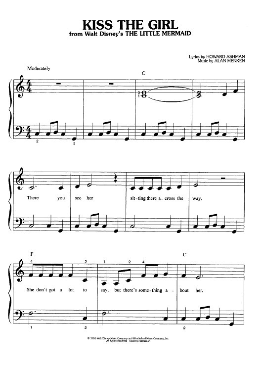 Digital Sheet Music for Kiss The Girl by Alan Menken, Howard Ashman scored for Big Note Piano; id:445117