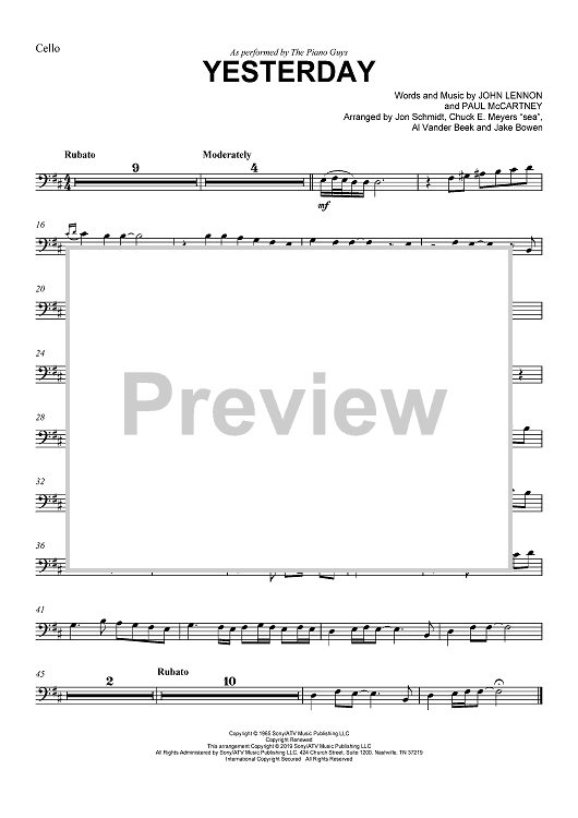 Digital Sheet Music for Yesterday (As performed by the Piano Guys) by Paul McCartney, John Lennon, Jon Schmidt, Al Van Der Beek, The Piano Guys, Chuck E Meyers "sea", Jake Bowen scored for Cello and Piano; id:467682