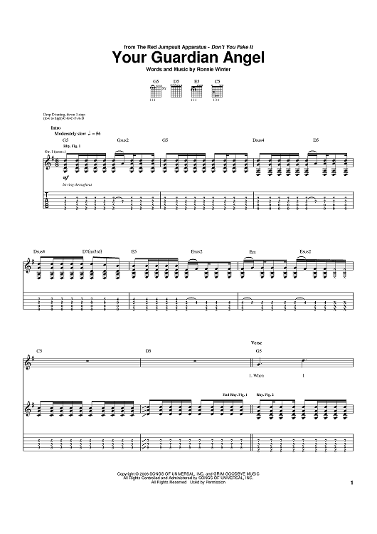 Digital Sheet Music for Your Guardian Angel by The Red Jumpsuit Apparatus, Ronnie Winter scored for Guitar Tab; id:398402