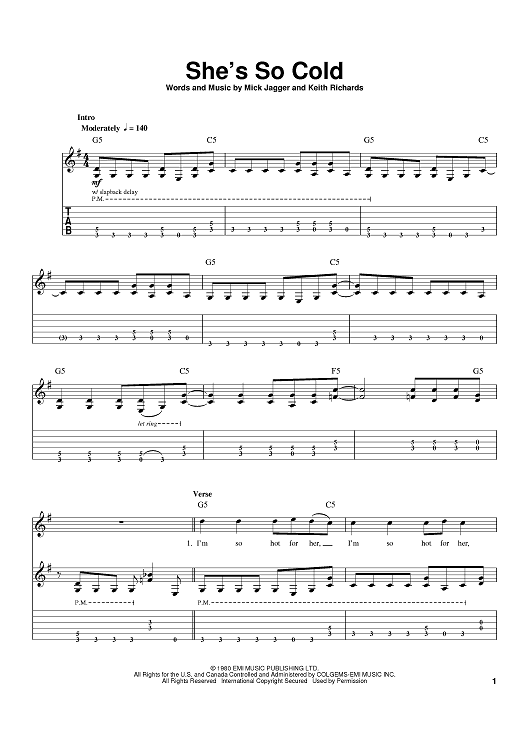 Digital Sheet Music for She's So Cold by Keith Richards, The Rolling Stones, Mick Jagger scored for Guitar Tab; id:396603