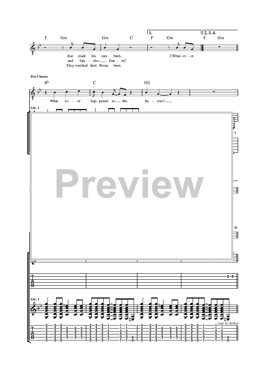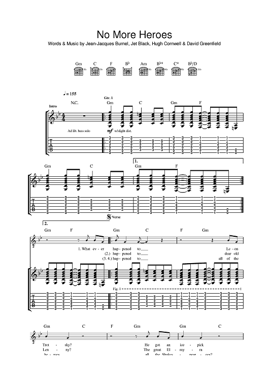 Digital Sheet Music for No More Heroes by Jet Black, Jean-Jacques Burnel, Hugh Cornwell, David Greenfield, The Stranglers scored for Guitar Tab; id:398743