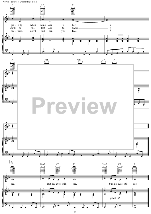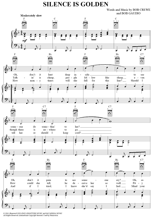 Digital Sheet Music for Silence Is Golden by Bob Crewe, Bob Gaudio, The Tremoloes scored for Piano/Vocal/Chords; id:367772