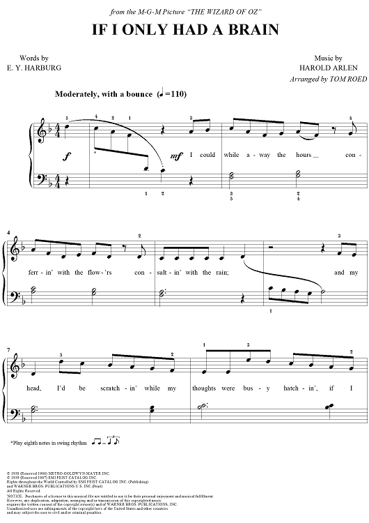 Digital Sheet Music for If I Only Had a Brain by Harold Arlen, Tom Roed, E.Y. "Yip" Harburg scored for Easy Piano/Vocal; id:289500