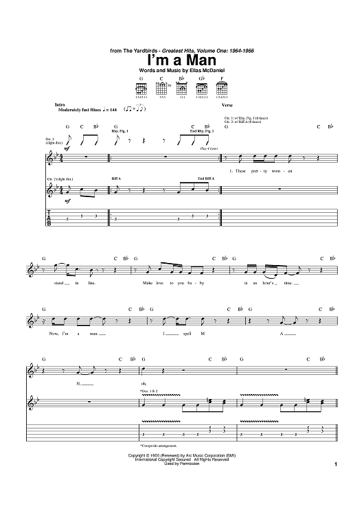 Digital Sheet Music for I'm A Man by Ellas McDaniel, Bo Diddley, The Yardbirds scored for Guitar Tab; id:371985