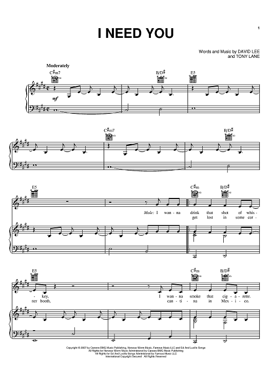 Digital Sheet Music for I Need You by Tim McGraw, Faith Hill, David Lee, Tony Lane scored for Piano/Vocal/Chords; id:397541