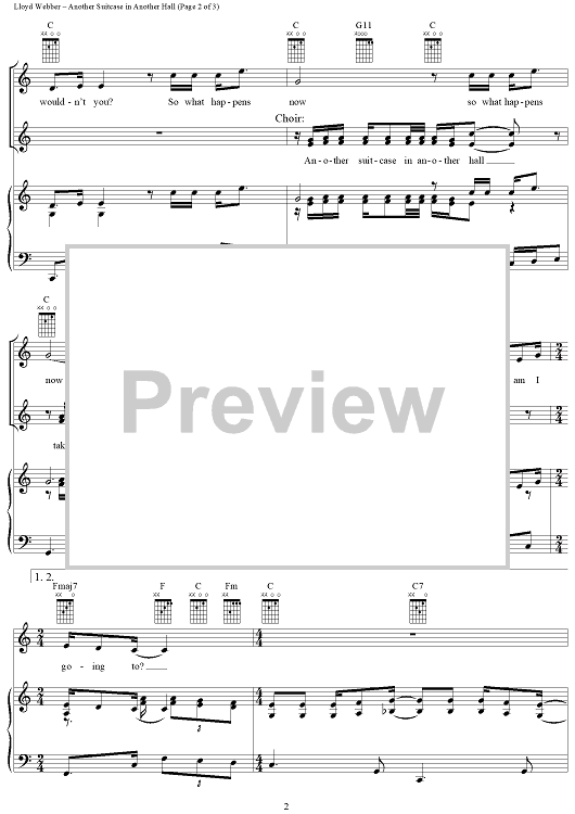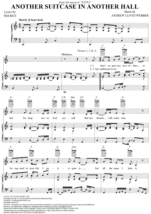 Digital Sheet Music for Another Suitcase in Another Hall by Andrew Lloyd Webber, Tim Rice scored for Piano/Vocal/Chords; id:236353