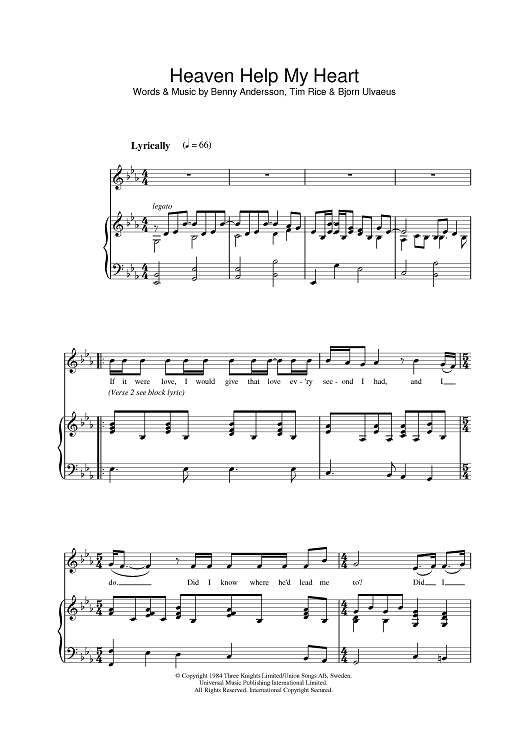 Digital Sheet Music for Heaven Help My Heart by Tim Rice, Benny Andersson, Bjorn Ulvaeus, Kelly Marie scored for Piano/Vocal/Chords; id:386951