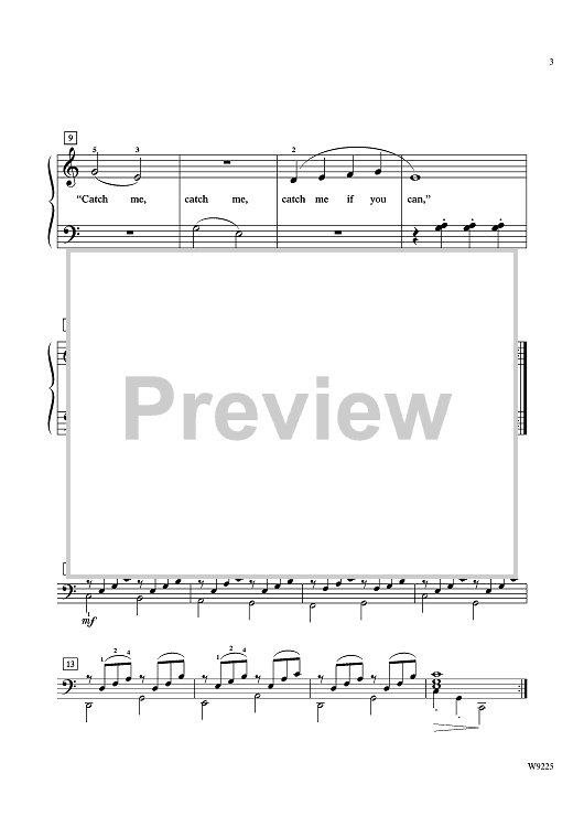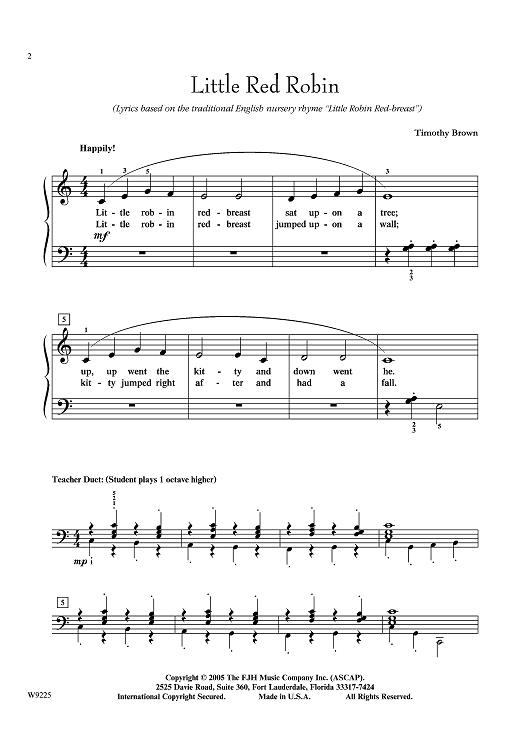 Based on the traditional English nursery rhyme Little Robin Red-breast, this piece has lyrics to tell the tale of a kitty chasing a robin. Uses 5-note finger patterns to effectively introduce one-, two-, and four-measure phrasing. An interesting teacher accompaniment adds to the story.