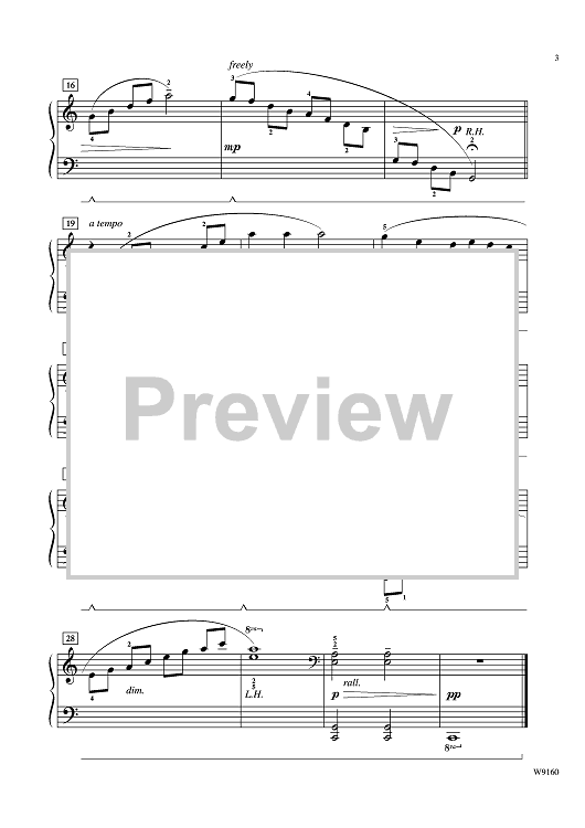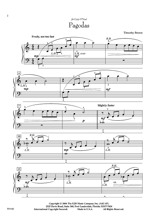 This delightfully impressionistic piece has a westernized sound that retains a hint of the East. Its flowing passages are quick to learn and easily accessible. Pairs of eighths alternate between the hands in arpeggiated runs. Sustained whole notes guide the occasional harmonic movement. Enchanting!