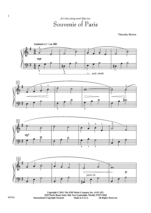 Written in the key of E minor and in 4/4 time, this piece has a wistful, lyrical melody that provides students practice in "singing out" the right hand melodic line. The left hand consists of a broken chord accompaniment creating an eerie, nostalgic mood. Students will love portraying a Parisian atmosphere.