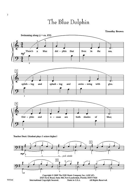 A charming early elementary piece that portrays a carefree and cheerful dolphin playfully swimming and splashing in the ocean. The student part consists of a single hand position without rests or accidentals. The optional teacher duet part suggests the gentle flow of ocean waves.