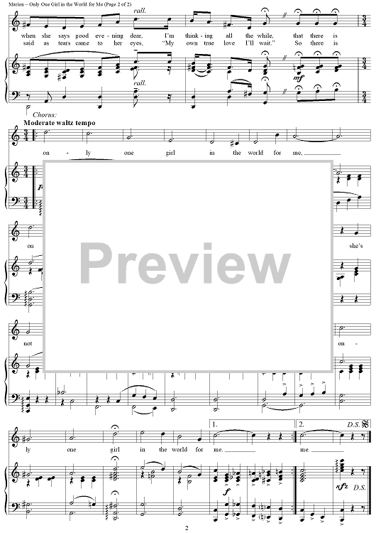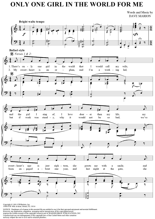 Digital Sheet Music for Only One Girl in the World For Me by David Marion scored for Piano/Vocal; id:251558