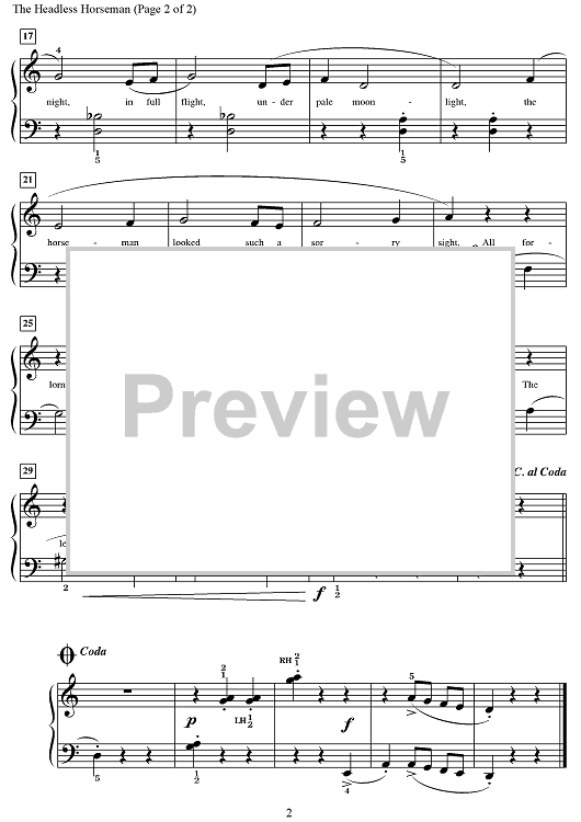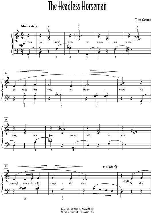 Based on the Sleepy Hollow legend, this lighthearted Halloween solo is in D minor, without the key signature for ease of reading. Clever and appropriate lyrics convey the fun side of the legend. At a moderate tempo, the use of extended-range gestures add color to the clip-clop musical quality, while the melody alternates between the left and right hand. Includes D. C. al Coda.