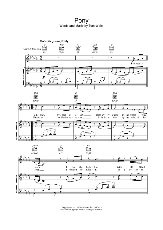 Digital Sheet Music for Pony by Tom Waits scored for Piano/Vocal/Chords; id:377381