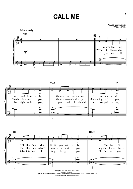 Digital Sheet Music for Call Me by Tony Hatch, Astrud Gilberto, California Chris Montez, Chris Montez, Petula Clark scored for Easy Piano; id:382099