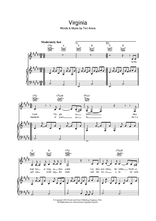 Digital Sheet Music for Virginia by Tori Amos scored for Piano/Vocal/Chords; id:392152