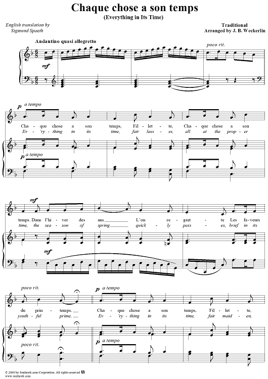 Digital Sheet Music for Chaque chose a son temps - (Everything in its Time) by J. B. Weckerlin, Traditional scored for Voice/Piano; id:260679