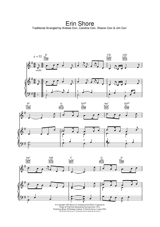 Digital Sheet Music for Erin Shore by The Corrs, Sharon Corr, Caroline Corr, Andrea Corr, Jim Corr, Traditional scored for Piano/Vocal/Chords; id:376801