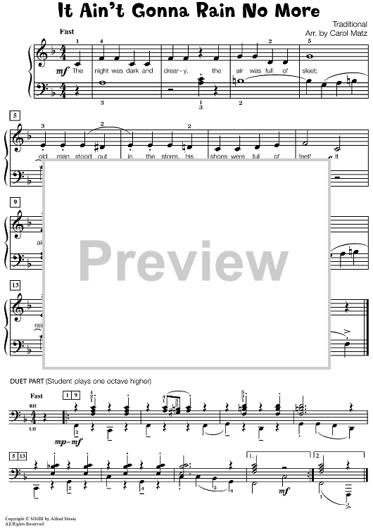 Digital Sheet Music for It Ain't Gonna Rain No More by Carol Matz, Traditional scored for Piano; id:497455