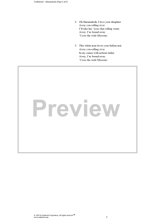 Digital Sheet Music for Shenandoah by Traditional scored for Piano/Vocal/Chords; id:111085