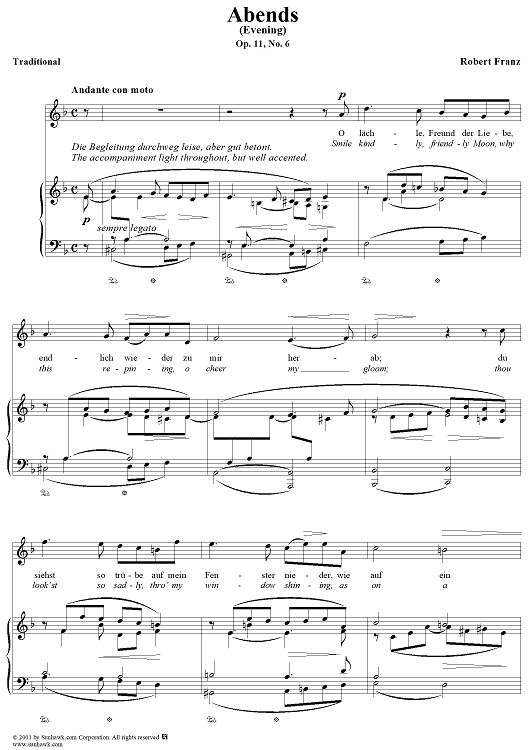 Digital Sheet Music for Six Lieder, op. 11, no. 6: Evening (Abends) by Robert Franz, Traditional scored for Voice/Piano; id:269288