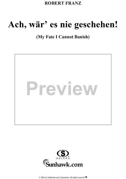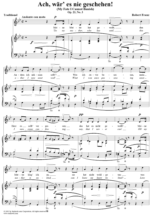 Digital Sheet Music for Six Songs on German Texts, op. 23, no. 3: My Fate I Cannot Banish (Ach, wär' es nie geschehen!) by Robert Franz, Traditional scored for Voice/Piano; id:269111