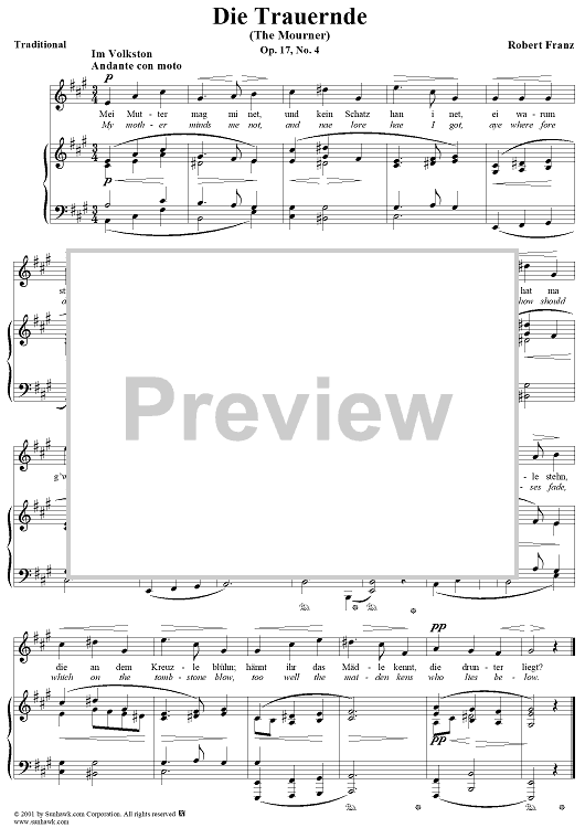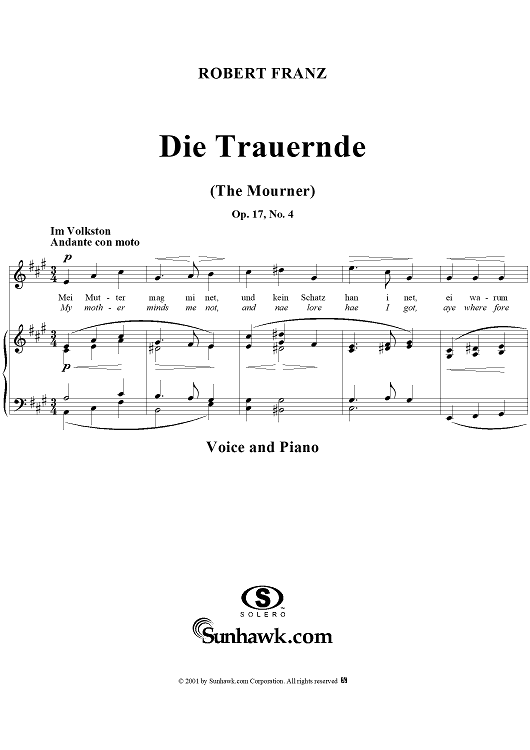 Digital Sheet Music for Six Songs, op. 17, no. 4: The Mourner (Die Trauernde) by Robert Franz, Traditional scored for Voice/Piano; id:269110